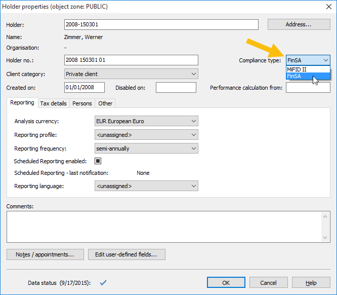 In the owner master data you will find the following selection list "Compliance type":