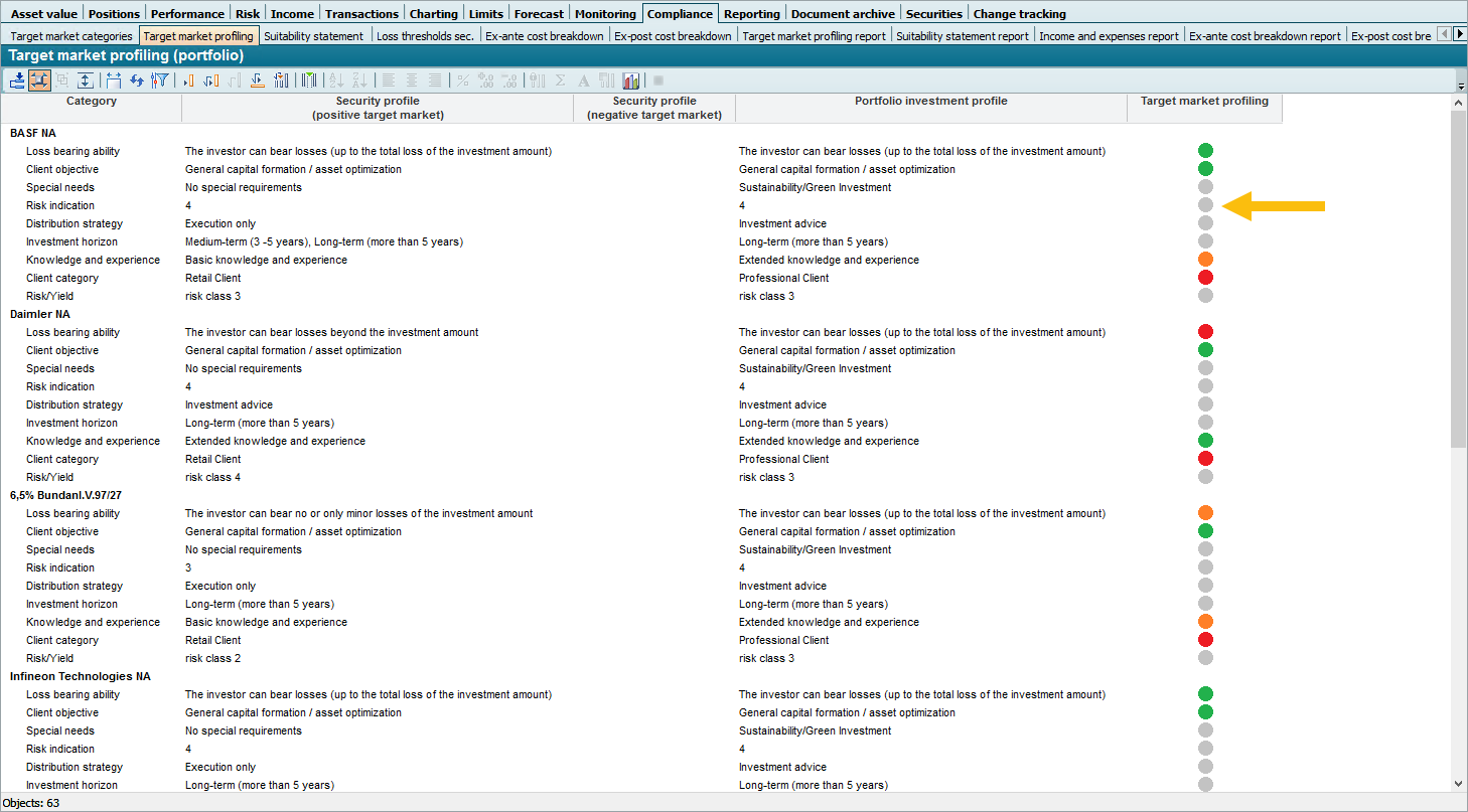 In the "Portfolio investment profile" column of the "Target market profiling (portfolio)", the non-FIDLEG criteria in the "Target market profiling" column are marked with gray symbols. This also applies if values are stored in the investment profile of the portfolio for the corresponding categories. These are then also displayed in the "Portfolio investment profile" column, but are not included in the profiling in accordance with FinSA.