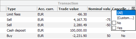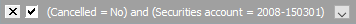 In this example, the list is filtered by two columns, namely by non-canceled transactions of the securities account "2008-150301".