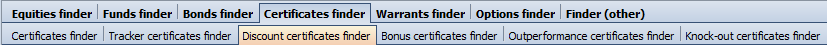 The "Finder Certificates Discount" is a table optimized for searching for these certificates, which you can use to configure individual search queries via the filter settings. In open security finders, the "Finder Certificates Discount" is stored on the "Finder Certificates" worksheet.