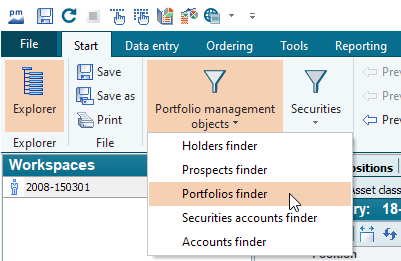 - Select the desired finder (FINDER INHABER, FINDER PORTFOLIOS...) in the menu that pops up.
