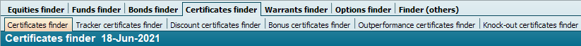 Search for your personal favorites among the many certificates using the finders optimized for this type of security with your individual search criteria. These finders filter securities of the type "Certificate". Use the filter field above the tables to narrow down your search as required. If necessary, please also read the chapter Filter/Finder.