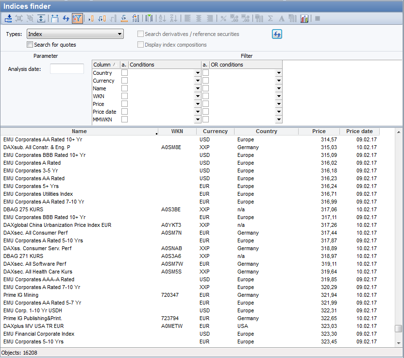 The "Finder Indices" is a table optimized for searching for indices, which you can use to configure individual search queries via the filter settings. Use the "Finder Indices" to search for suitable benchmarks, for example.