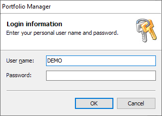 When starting the Infront Portfolio Manager, the login dialog for entering the user name and password appears. The delivered standard database contains the predefined user "DEMO", with which you can log in to your Infront Portfolio Manager (initially without a password).