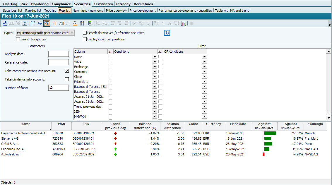 The flop list is Ranking list, which only lists the worst-performing securities of the input object compared to the previous day. You can set the number of flops via the parameters. You can see the currently set number immediately in the title bar of the flop list.