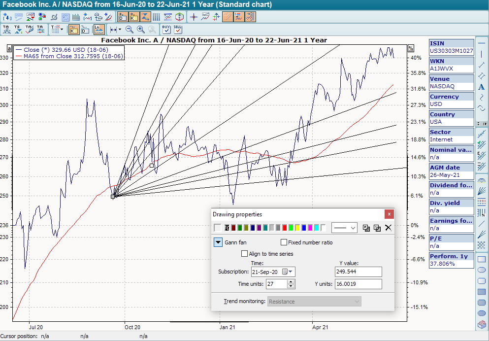 Click on the "Gann fan" icon.- Draw the Gann fan by clicking with the mouse on the reference point (start) for the fan.