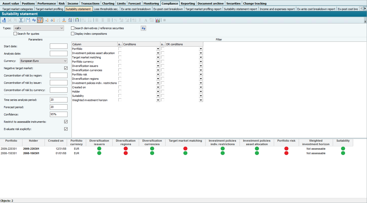 The "Suitability report" evaluation checks the portfolio for suitability with regard to the investment profile stored. The "suitability report" is based on WM data, the risk calculation on the value at risk.