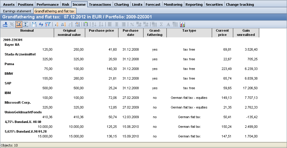 You can find the "Portfolio protection and withholding tax" evaluation on the "Income" worksheet, "Portfolio protection and withholding tax" in the workspace of holders or portfolios, for example.