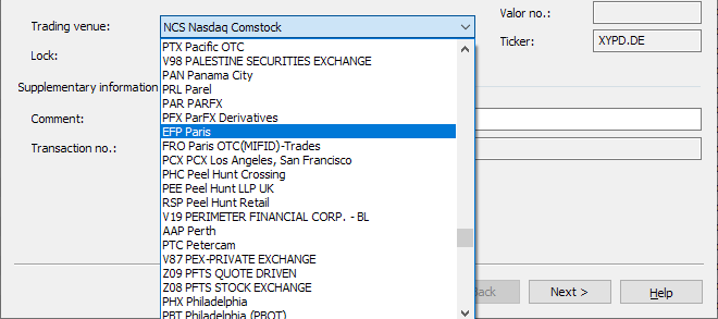 In the dialog windows for entering orders, you can select the place where you bought the security from a list of all trading venues. The trading venue is stored with the order for information purposes (irrespective of the venue stored in the security or in the respective price quotation) and is a MiFID requirement.