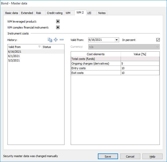 You have the option of storing securities costs (product costs) historically in the master data. You can manually enter values for total costs, entry and exit costs and running costs.