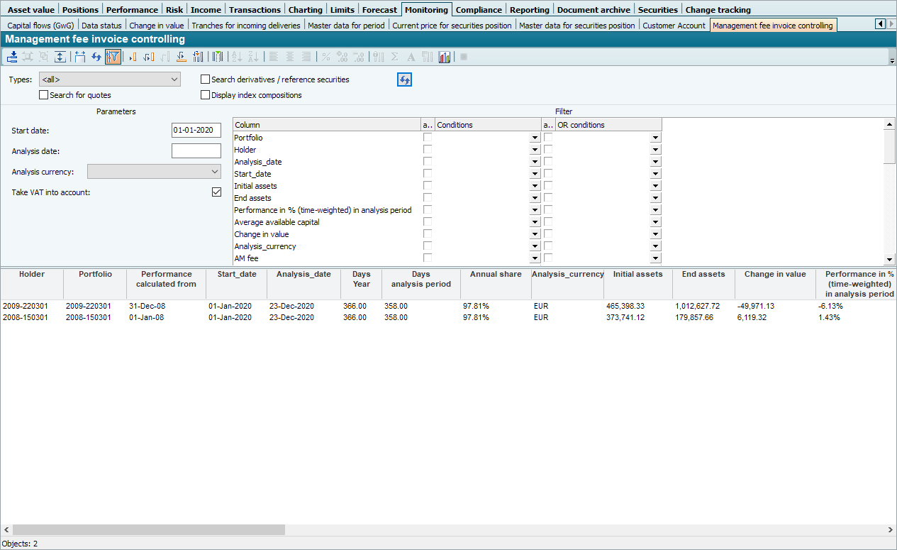 In the workspaces of depot objects, you will find the "Fee controlling" worksheet on the "Monitoring" worksheet. In the list of templates, you will find the evaluation in the "Depot management" category.