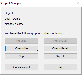 - If there are already objects in your Infront Portfolio Manager that correspond to those in the import file, a new dialog box will appear. Choose between the options "Overwrite" and "Skip":