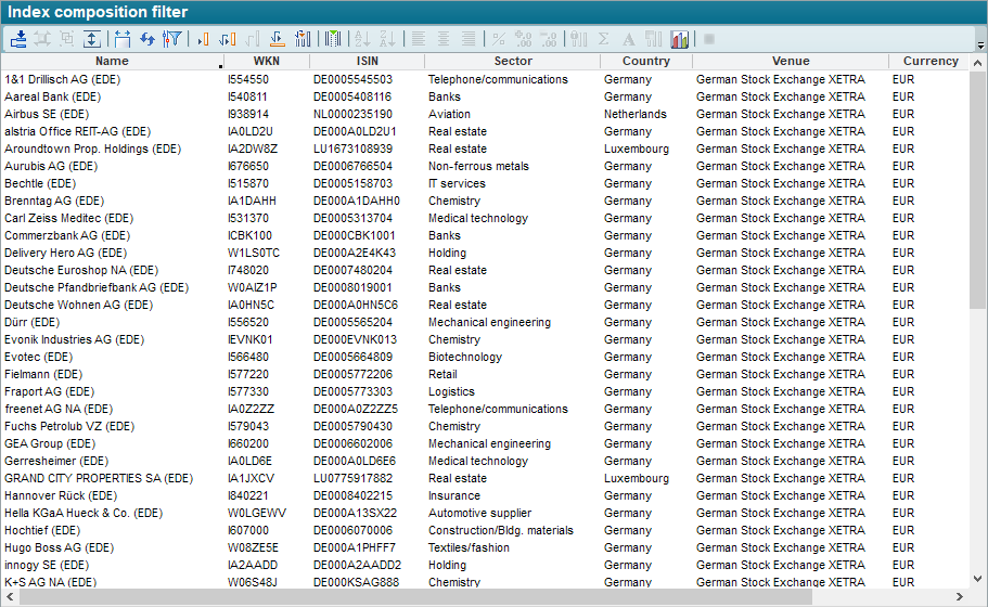 If you open this evaluation for a security of the type "Index" whose index composition has been maintained, the index elements (price quotations) and their master data and prices are displayed in the index composition filter. The template is therefore suitable as a filter template that can be used for a