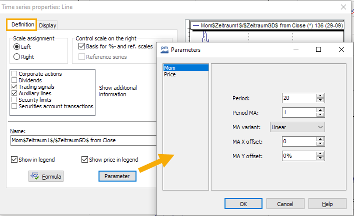 - You can easily add indicators that you have changed in the chart to the pull-down menus. Select the command ACCEPT AS FORMULA ELEMENT... in the context menu of the indicator. Please read the section Chart form elements.