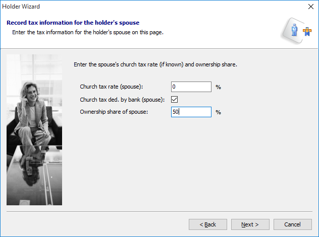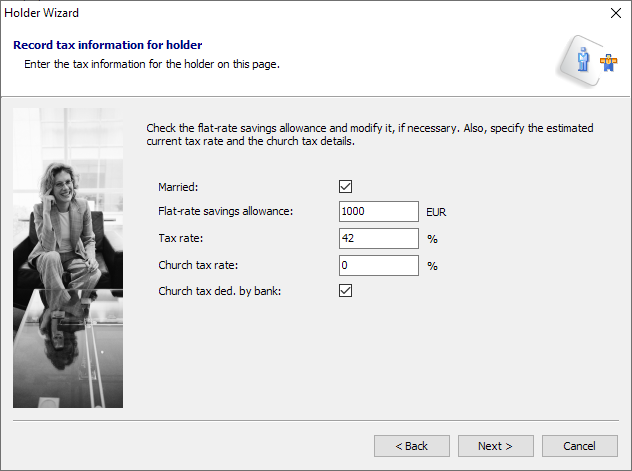 - Click on the "Next" button to go to the next page, or click on "Back" to return to the initial page of the Owner Assistant. On the next page, enter the holder's master data (e.g. information on church tax or the saver's lump sum).