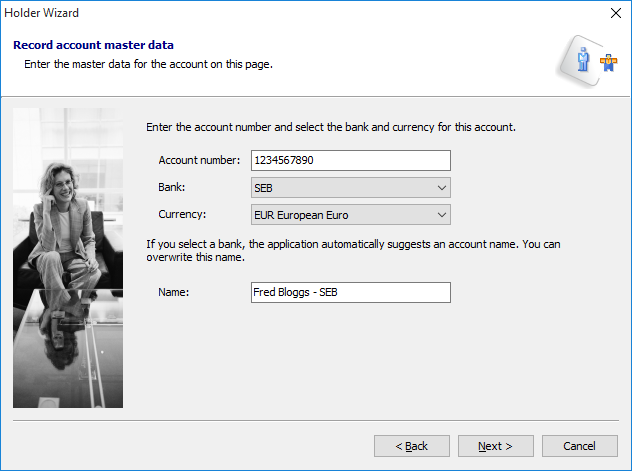 - Select the "Next" button and enter the master data of the associated account (account number, bank, currency and name) on the next page.