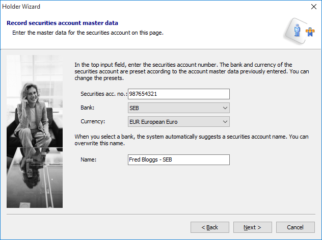 However, if you have activated the "Create additional account and securities account" option, you will have to go through the input pages for the account and securities account master data again until you have created all the desired accounts and securities accounts.
