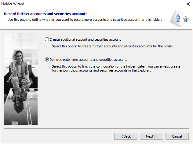 - If you do not wish to assign any further accounts and securities accounts, the last page of the holder wizard appears. If you close this with the "Finish" button, the owner and associated accounts and securities accounts are created in the Explorer in the "Securities account management" folder. If no folder with this name exists, it will be created automatically.