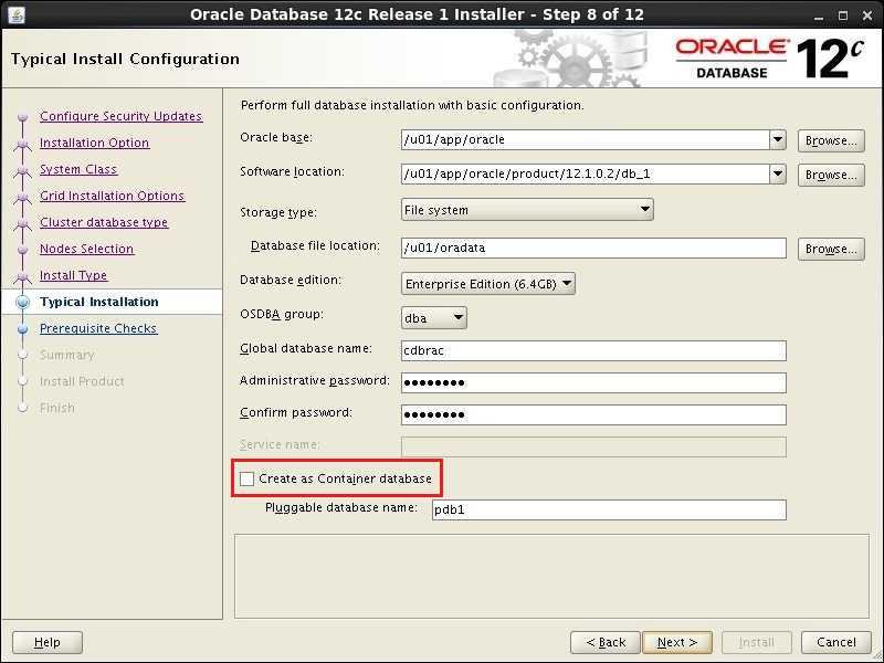 The use of container databases is not supported. If you are using Oracle 12c, make sure that the "Create as container database" checkbox is deactivated during configuration: