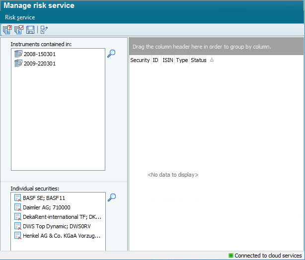 The worksheet has two object lists on the left-hand side. The securities contained in the list below ("Individual securities") are registered in the risk service. Objects other than individual securities can be specified in the upper list ("Instruments contained in"). For example, owners, groups and filters can be specified here. During the registration process, the securities, accounts and special investments contained here are liquidated. This list can be used, for example, if it is known that the risk service is to be used regularly for certain holders or securities accounts. If the securities contained change, the changed instrument quantity will be registered during the next registration process.