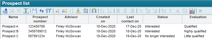 Filter the table e.g. by interested party rating, supervisor or "Created on" date of the prospect. If necessary, read the section Prospect properties for the individual master data.
