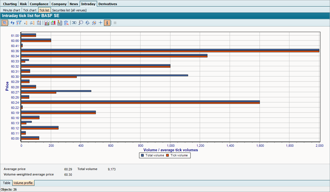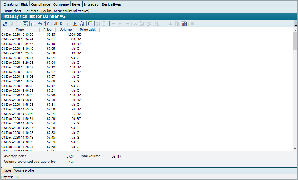 The "Intraday tick list" shows the current price and volume of a security per tick. In the footer you will also find the average price and the total volume.