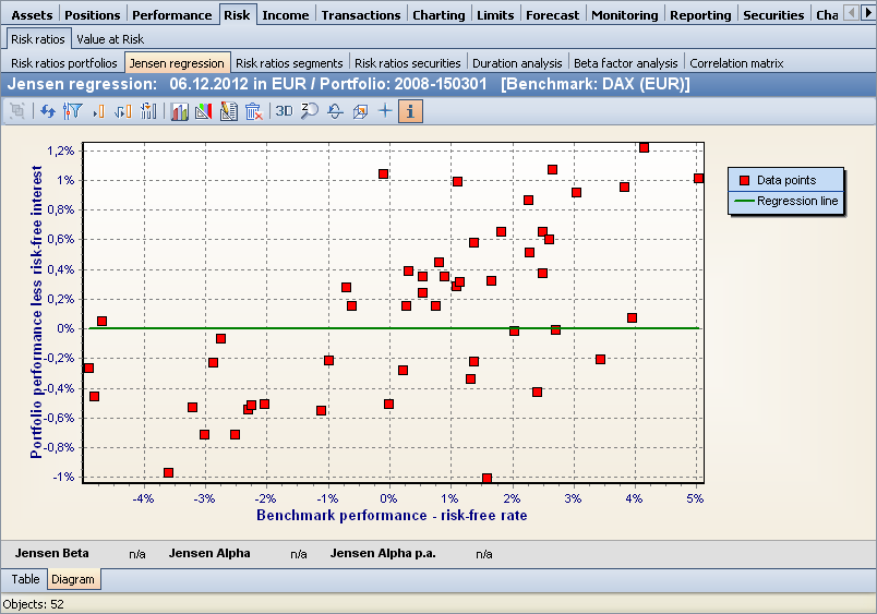 This evaluation provides both a table and a graphic for visualizing the Jensen regression for portfolios, which opens by default. Use the familiar tabs at the bottom of the evaluation window to switch between table and graph view. You can find the evaluation in the workspaces of holders, portfolios and custody accounts on the "Risk" worksheet, "Risk figures".