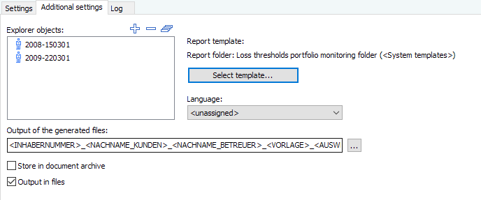Button "Select template..." | Select this button to select a new template of the type "Report folder" for this loss threshold reporting in the familiar "Open template" dialog box, which only displays useful templates. |