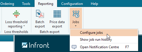 On the "Reporting" tab in the ribbon, select the CONFIGURE JOBS command in the "Jobs" icon menu.