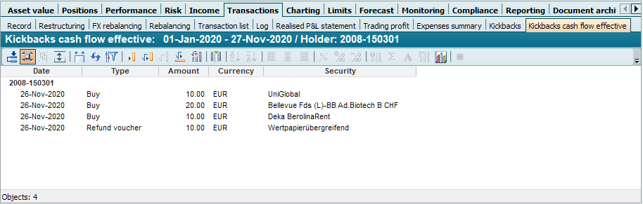 In the workspaces of portfolios, holders, securities accounts or groups, you can quickly open these in the delivery state via the "Transactions", "Kickbacks cash flow effective" worksheet.
