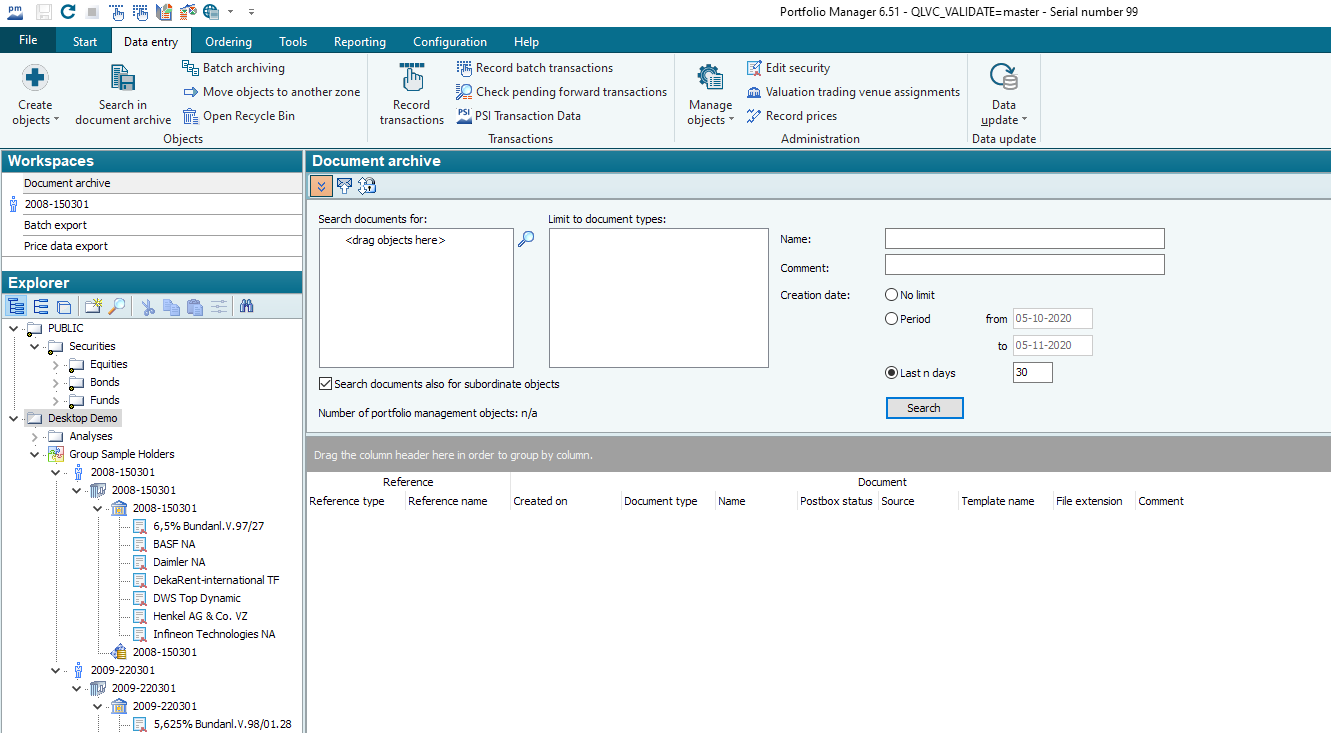 Open the document archive via the "Search document archive" icon on the "Data maintenance" tab. In this case, you can search for and manage documents for any securities account object.