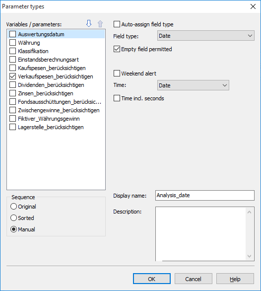 The "Parameter types" dialog box is dynamic, i.e. depending on the settings you make here, new fields appear in which you can make further entries.