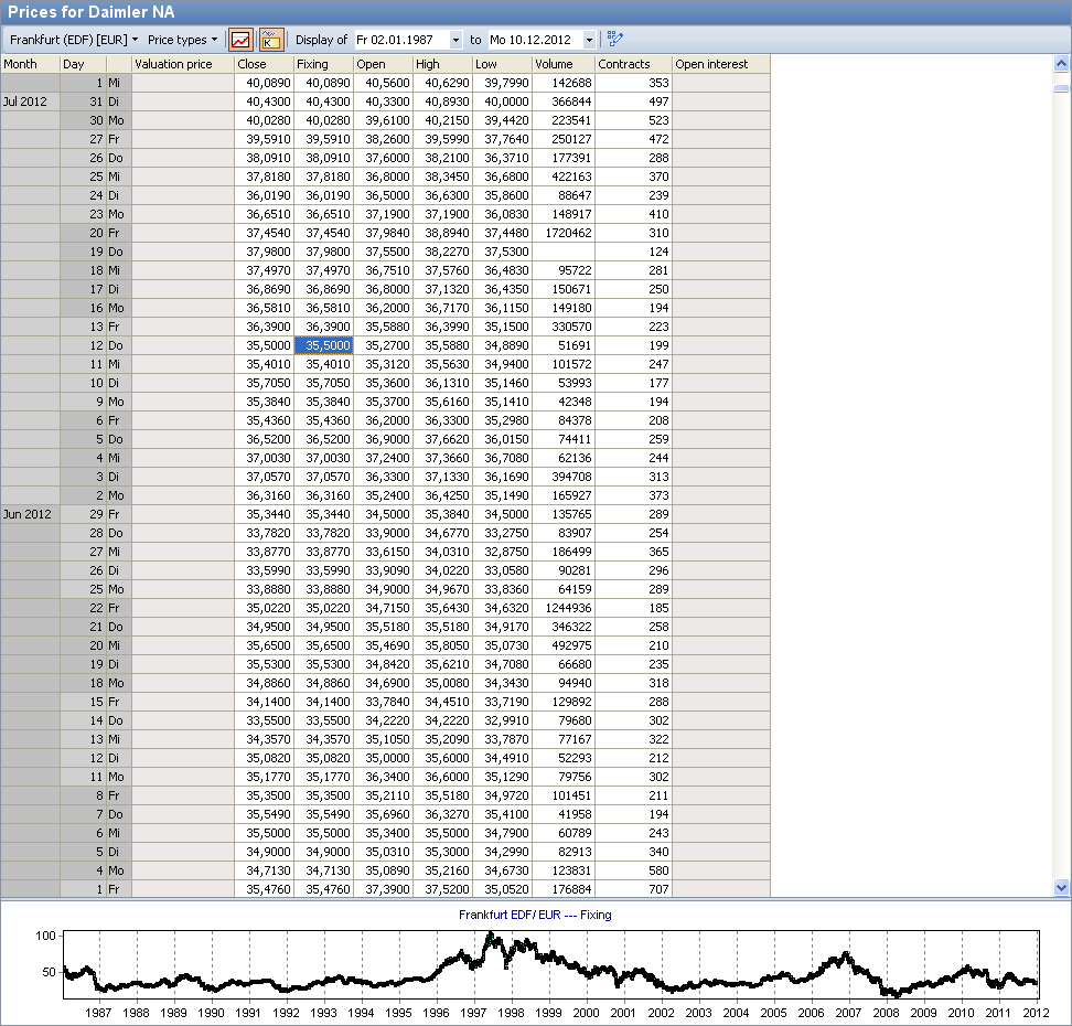 With the help of the chart you can directly recognize price jumps or similar. Drag the dividing line of the chart window to change the size of the chart display.
