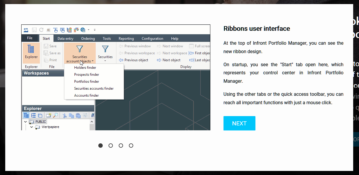Use the "Next" button or the round navigation elements at the bottom to jump to the next pages of the short introduction.