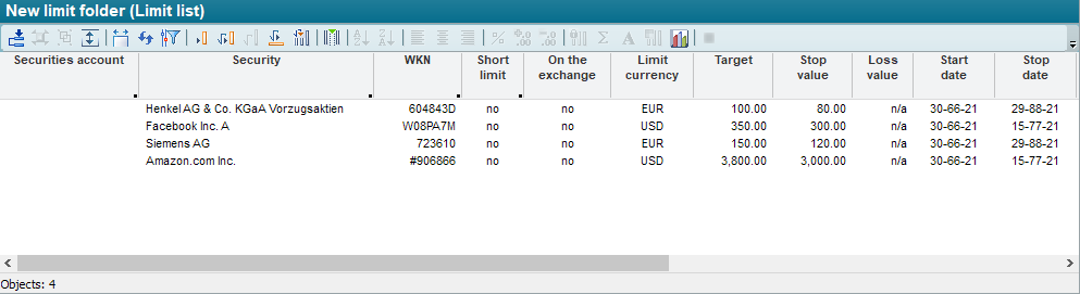 Open the workspace of a limit folder, e.g. by double-clicking on the limit folder in the Explorer. The relevant evaluations can be found in the workspace on the "Limits" worksheet. Select the "Limit list" worksheet, which displays a list of all securities limits that have been entered for this folder.