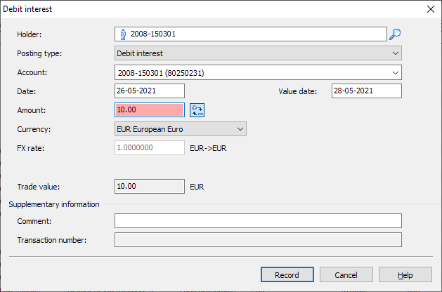 Select the "Debit interest" transaction type in the "Interest" category in the account transaction types on the left by clicking on it. The "Debit interest" dialog box appears.