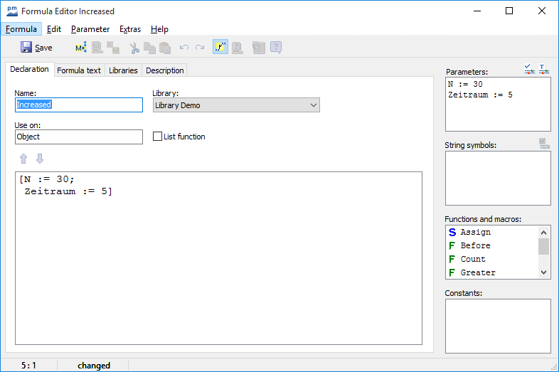 - Enter the formula text in the editor (the usual MM-Talk syntax applies). If you use a user-defined macro in the new macro, the corresponding library must be integrated into the formula by moving it to the list of libraries used on the "Library" tab. More on this in the section Integrate libraries into macros.