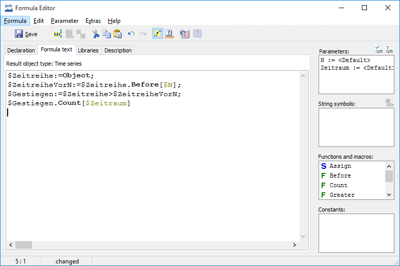 Save the newly created "Increased" macro. You can now use it in other formulas, e.g. to display an additional time series in a chart using the formula "Close[].Increased[]".