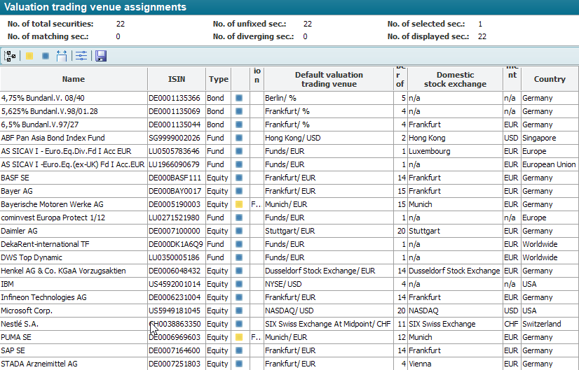 | Use the save icon to save the valuation place assignments for the securities currently displayed and selected. For this purpose, the default (column "Valuation location default") is adopted as a fixing. |