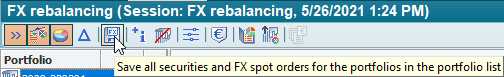 - Select the "Save all securities and FX spot orders for the portfolios in the portfolio list" icon in the toolbar of the rebalancing tool to save the generated orders for all portfolios in the portfolio list.