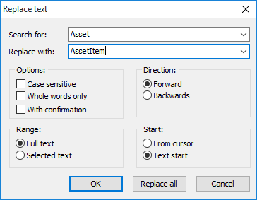 Replace | <STRG>+<R> Opens the "Replace text" dialog box in which you can define your replacement process.