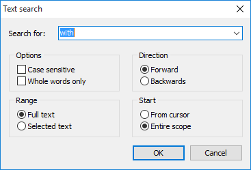 The "Search for" input field may be pre-assigned with the text of the current cursor position. | |
