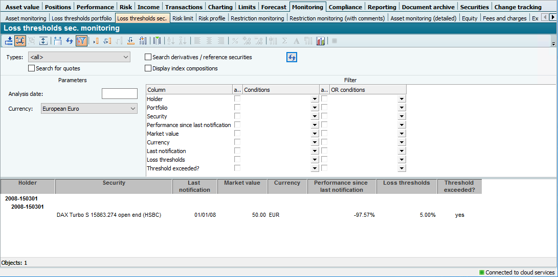 The "Monitoring loss thresholds WP" evaluation only monitors leverage products, i.e. derivative securities. In the securities master data, the "WM leverage product" checkbox on the "WM 2" tab is activated for such securities.