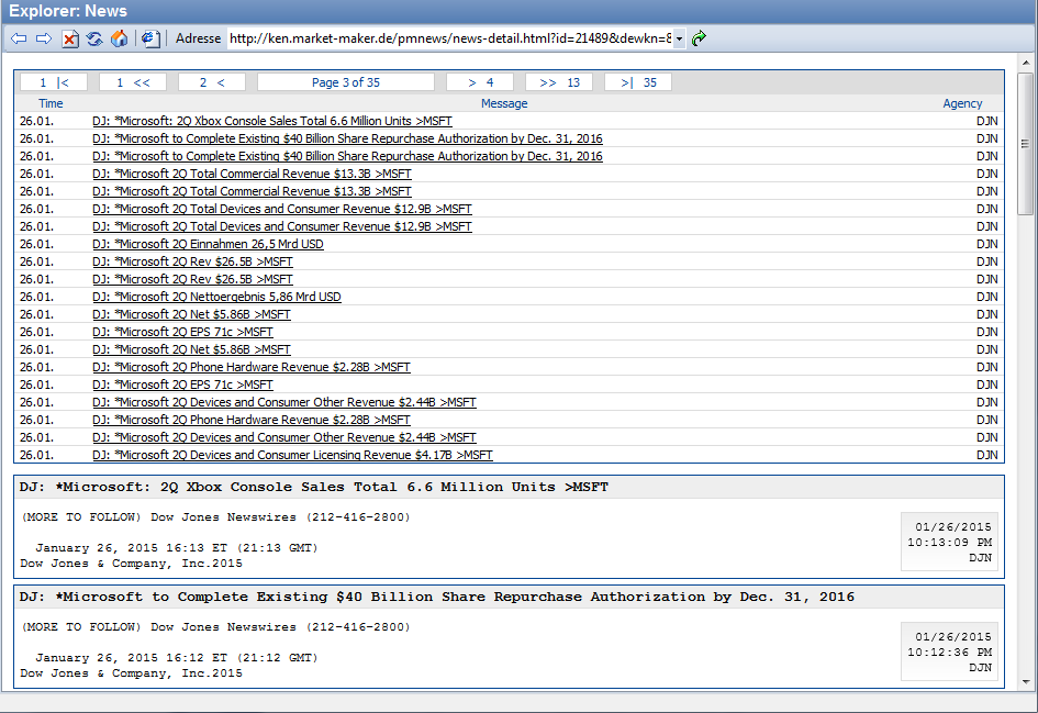 For example, open the "News (Online)" worksheet for a company in the "Dax" filter folder and then click with the middle mouse button on other securities in the Explorer to quickly obtain a news overview of your favorites in the DAX.