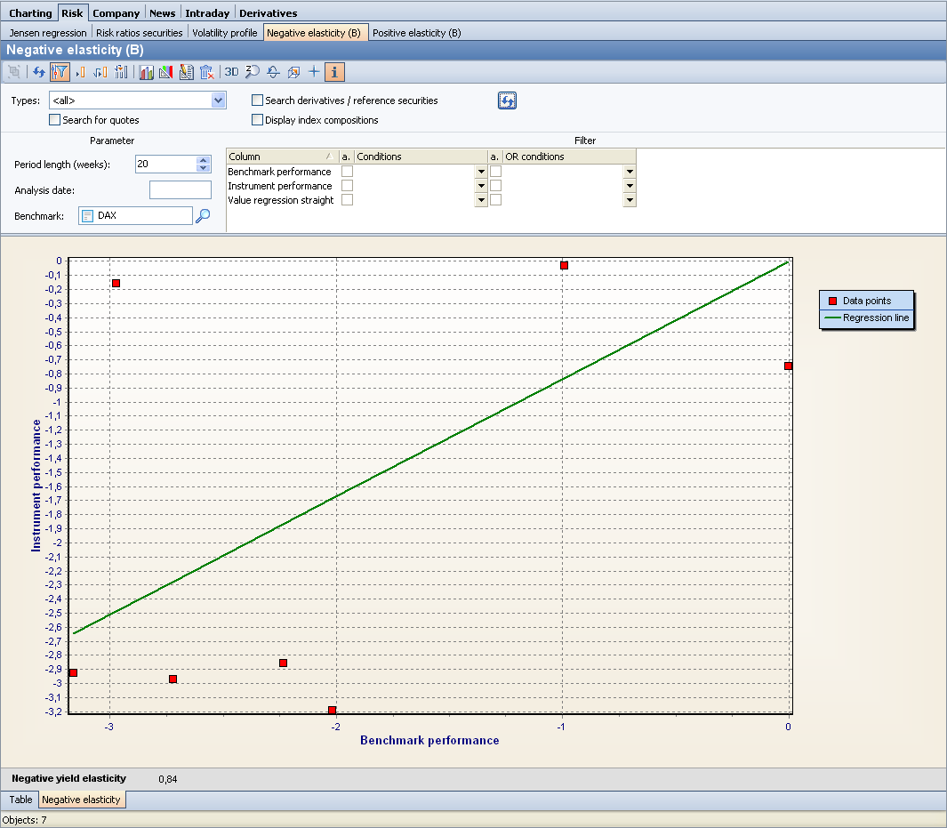 This evaluation provides both a table and a graphic for visualizing the negative elasticity, which opens by default. Use the familiar tabs at the bottom of the evaluation window to switch between table and graph view. You can find the evaluation in the securities workspace on the "Risk" worksheet.