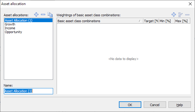 Now add the desired basic asset class combinations and define the target, minimum and maximum values for these. You can find out how to create and edit basic asset class combinations in the section Edit asset allocation models.