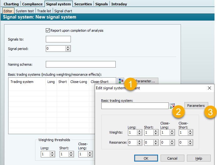 Mark the folder with the right mouse button and select the command NEW, SIGNALSYSTEM in the context menu. Or select the command SIGNALSYSTEM in the menu of the "Create objects" icon on the "Data maintenance" tab, then the new signal system is always created under the signal folder "Signal systems" in the Explorer (by default under "Evaluations"). If this does not exist, vwd portfolio manager automatically creates one. In the "Signal system properties" dialog box that appears, enter a meaningful name in the "Name" field and confirm with "OK". A signal system object with this name is created under your signal control and an "Input" folder is created under it. The workspace with the editor for the signal system properties is also opened.