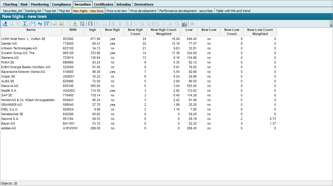 In this example, 3 of the DAX 30 stocks reached new weekly highs during the evaluation period.