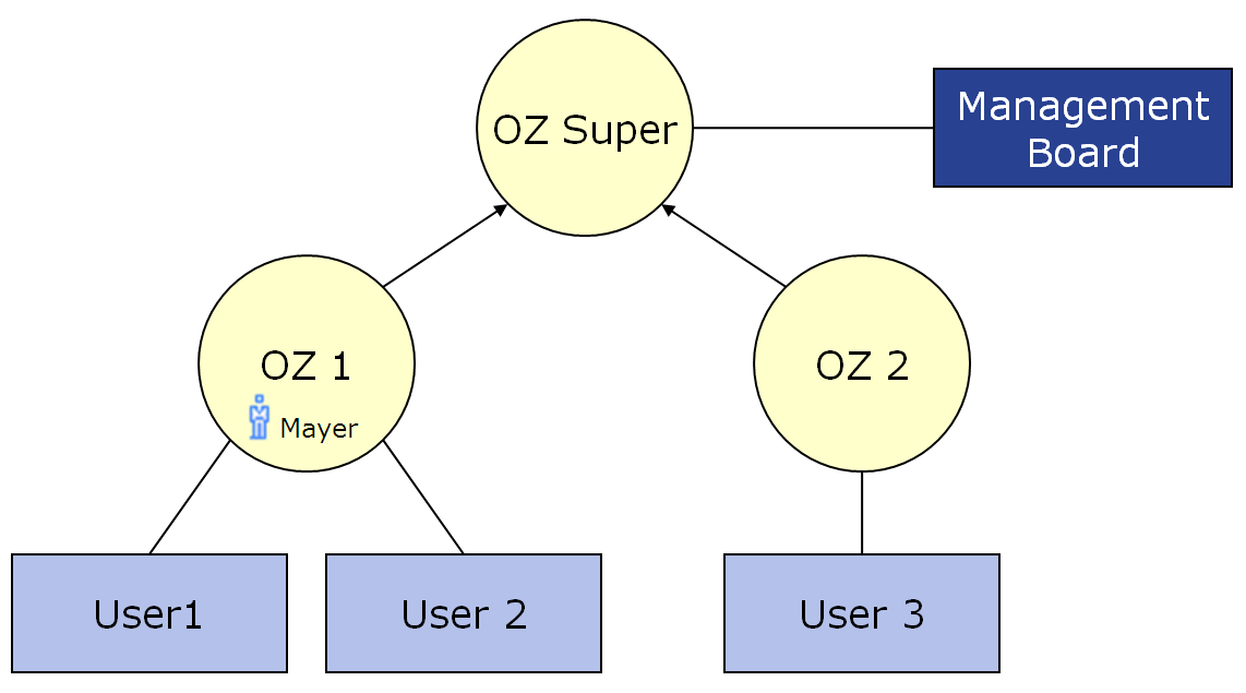 In this example, object zone 1 ("OZ 1") contains, among others, the "Owner Mayer". This is visible for user 1 and user 2, as these two users are directly connected to object zone 1. However, by linking to the Super object zone ("OZ Super"), the "Management Board" can also see the "Owner Mayer" object. User 3, on the other hand, does not see the "Mayer owner" (or any other objects in object zone 1).