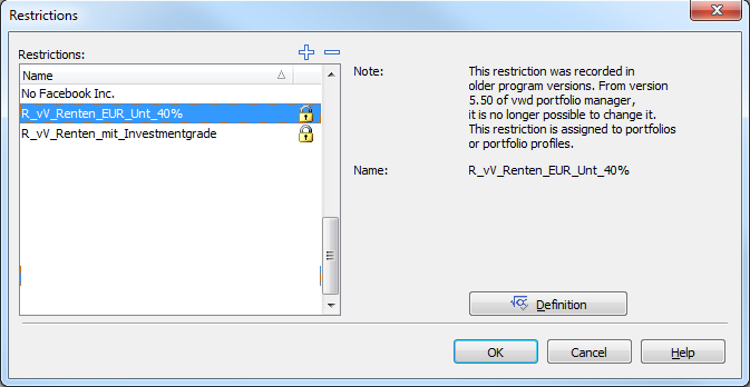 Your restrictions created with older program versions are retained. However, as of Infront Portfolio Manager 5.50, these can only be deleted, but no longer changed. You can create new restrictions based on these "old" restrictions, e.g. by copying the MM-Talk formula into the definition of the new restriction.